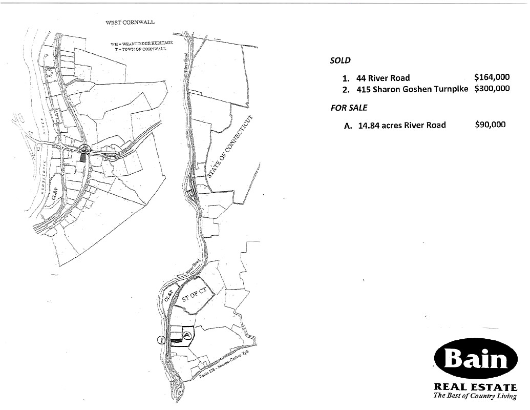 415 Sharon Goshen Turnpike, Todd Piker's Pottery Store has been sold and that is the reason I delayed this letter. This business location is prime and the new owners are James and Idella Shepard, the owners of the Cornwall Country Market in Cornwall Bridge. CJ's Hairworks will continue in his corner location and it is thought that perhaps the balance of the retail space may be divided for new businesses. The building sold for $300,000, above appraised value.