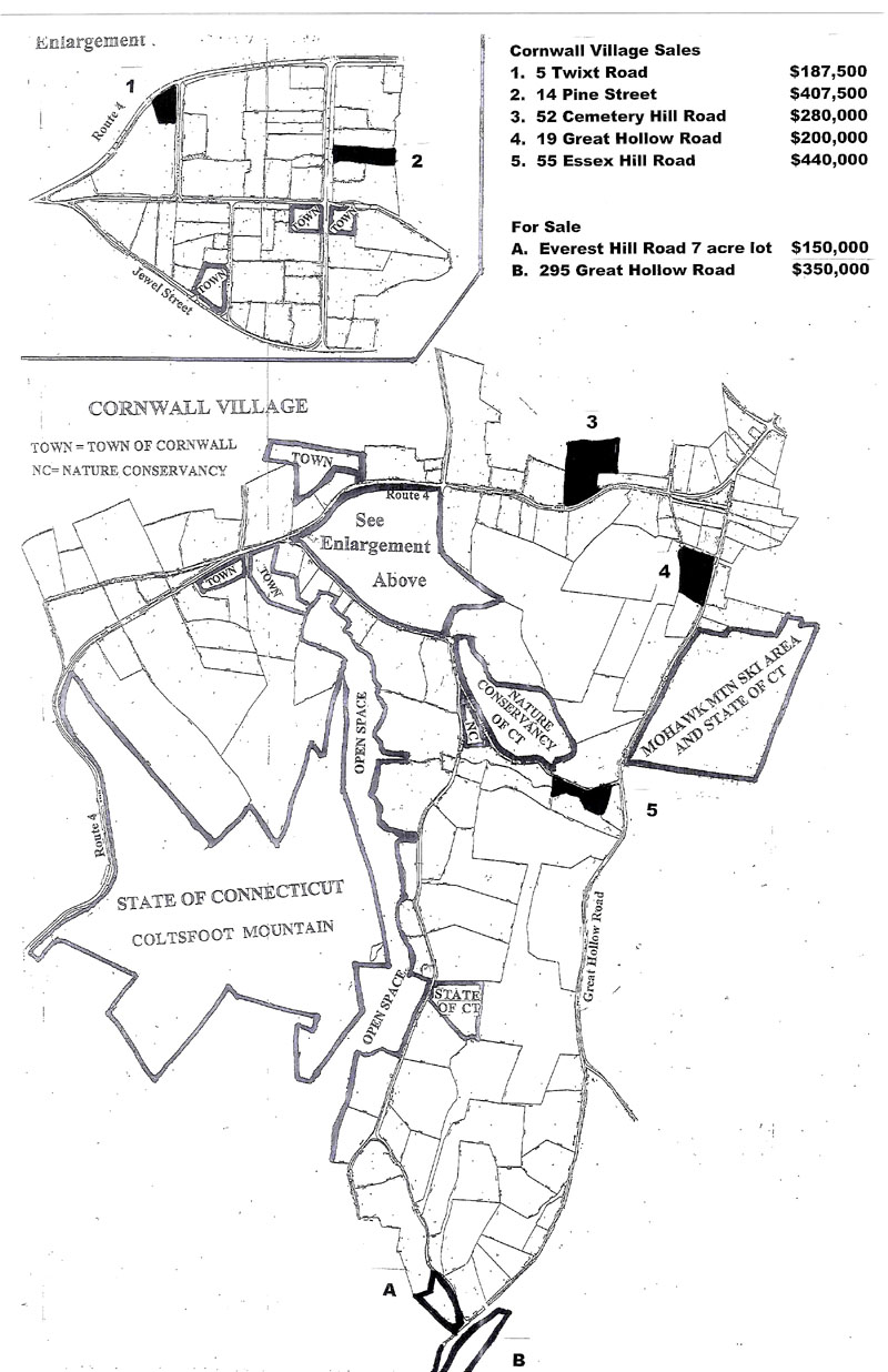 Last fall, we reported 14 sales. This fall, we have 10 sales to report; both homes and land. This area of Cornwall is always one of the most active. In the report below I have compared the sales prices to the town appraisals. While these appraisals are not reliable to establish individual current market value, in Cornwall they are remarkably close and provide an interesting check on the market.
