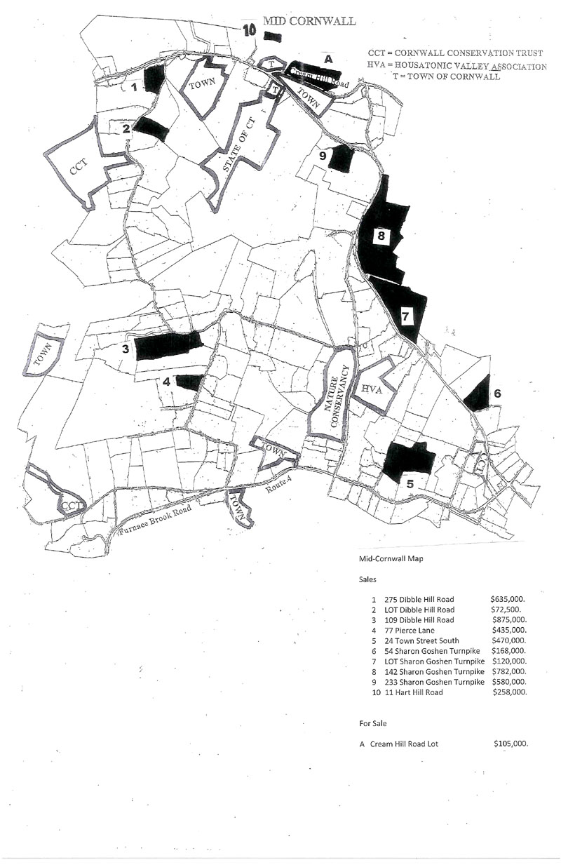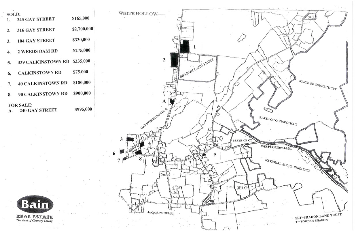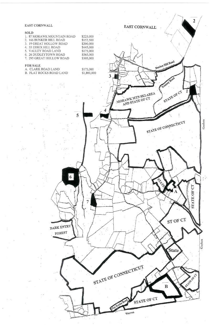A 16.57 acres on the north side of Sharon Goshen Turnpike just after Route 125 branches off to the village, is a wooded lot with a brook and a hillside with some stone walls, large enough to be subdivided with several suitable building sites was listed at $149,000 and closed at $120,000. Rick Meehan of our Cornwall office sold this property.