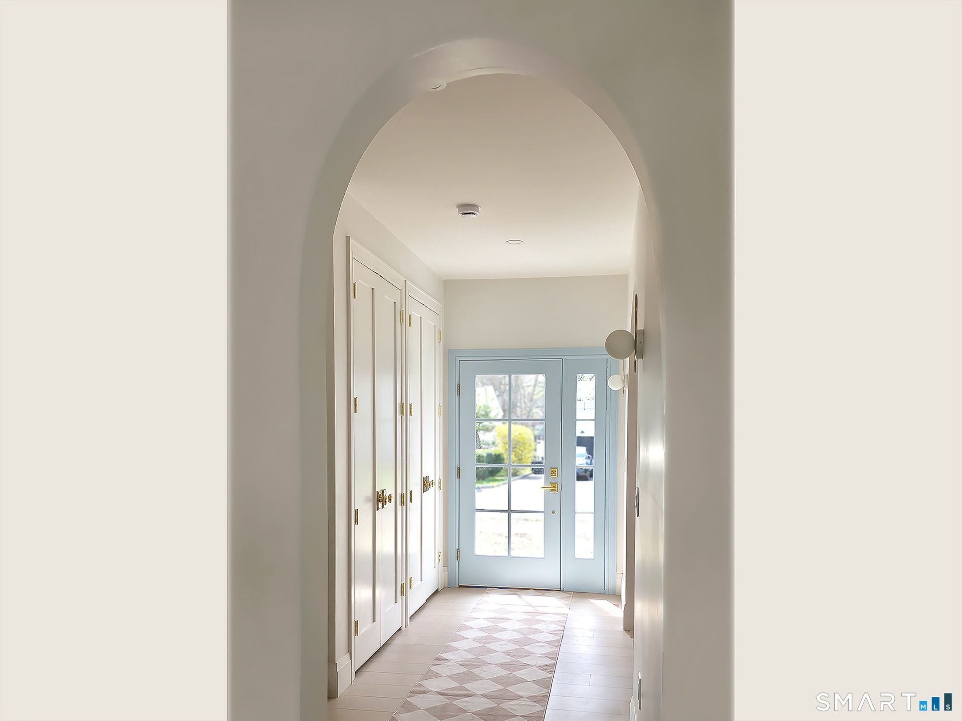Step into this fully gut-renovated, reimagined rare gem in Riverside. Expanded to nearly double its original footprint, this beautiful home has been meticulously designed by Abode Interiors NYC. A striking bend of graceful arches, soaring 9 & 10 foot cathedral ceilings, wide Brazilian oak floors, a marble fireplace, & all-new windows filling the space with light. At the heart is an Architectural Digest-worthy custom eat-in kitchen, beautifully appointed with Calacatta Gold marble backsplash, quartz countertops, Bosch appliances & bespoke millwork. The dining area opens to a deck via 12-ft sliding doors for seamless indoor-outdoor living. Upstairs, a light-filled, spacious lofted living area offers a versatile retreat for relaxing, or entertaining. On a private floor the primary suite is a serene escape, with a custom-designed closet & a spa-inspired bath with soaking tub. Bedrooms are on separate floors, offering privacy. Outside, an oversized deck overlooks an expansive backyard framed by lilacs, irises, & hydrangeas, complete with a charming brick shed & flower beds. All new systems & structures, including a new expanded paver driveway, Hardie siding, dual-zone HVAC on Google Nest, tankless water heater, upgraded electrical, soundproofing & more-offering effortless turnkey living. Ideally located minutes from parks, Riverside Mall, & Old Greenwich shopping.