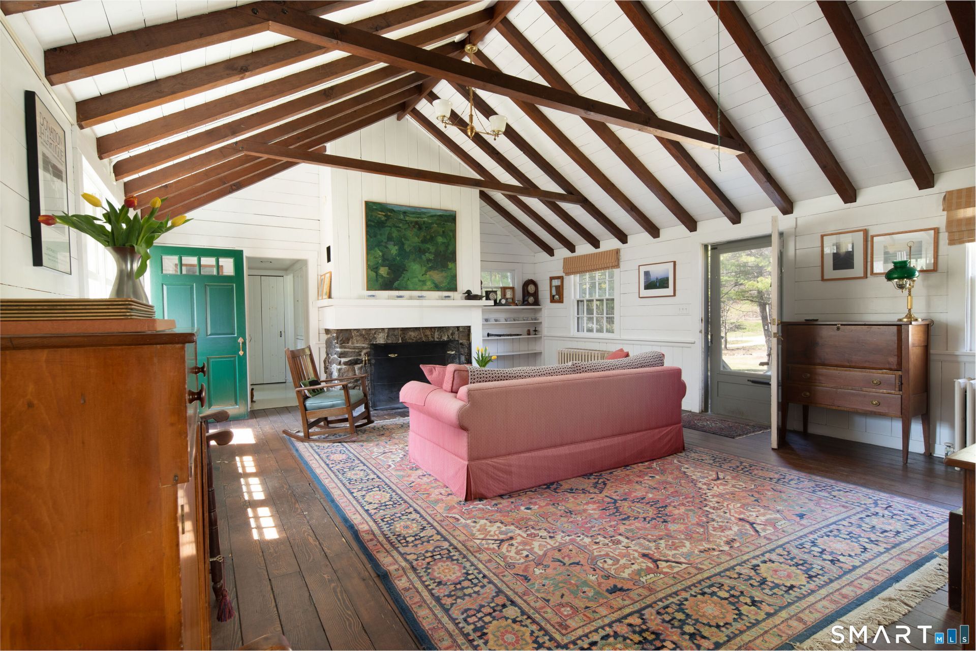 This delightful cottage located on Salmon Kill Road in Salisbury features impressive high ceilings right when you step into the Great Room, which encompasses both Dining and Living Areas highlighted by a fieldstone fireplace. The two Bedrooms and two full baths are filled with natural light. Beautiful stone gardens guide you to a backyard enveloped by mature trees, leading to a Shed that provides various possibilities.
