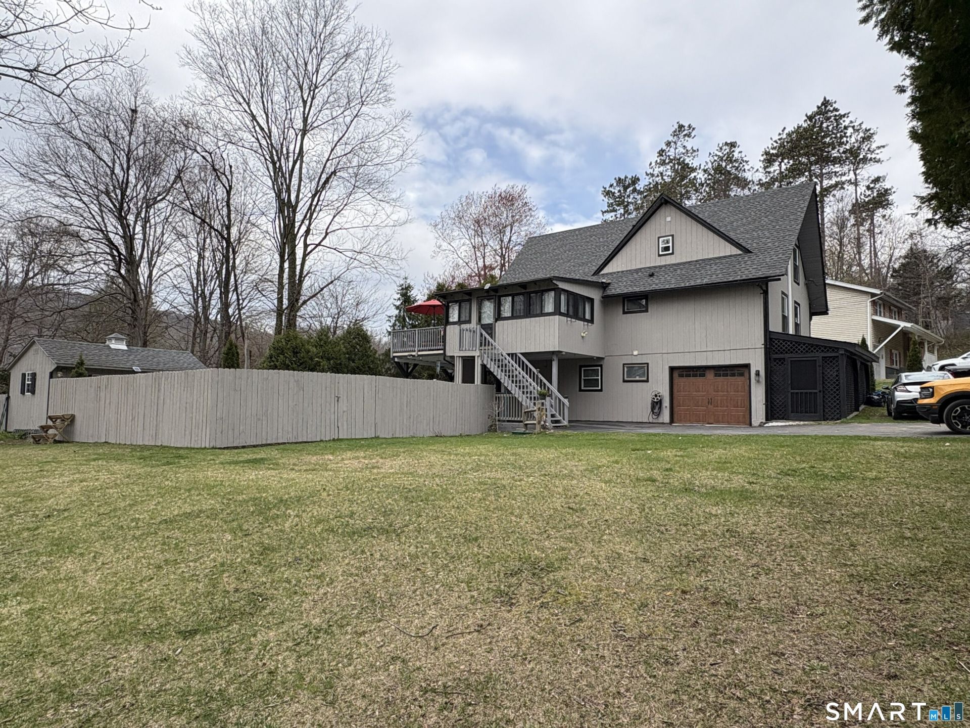 Welcome to this move-in ready 2-bedroom, 3 full bathroom home, perfectly situated within walking distance to Candlewood Lake. Thoughtfully updated, the home features a new ductless heating and air conditioning system and a generator with a direct hookup, offering peace of mind during power outages. The open floor plan showcases a stunning kitchen with a granite-top island and quartz countertops, flowing seamlessly into a spacious living area anchored by a cozy pellet stove. The adjacent dining room is filled with natural light, thanks to an abundance of windows that create a warm and inviting atmosphere. The primary bedroom offers a large walk-in closet, providing excellent storage and comfort. The lower level offers a generous family room complete with a sink, refrigerator, and a second pellet stove, along with direct access to the one-car garage-perfect for entertaining, adding valuable flexible living space. Enjoy outdoor living on the upper deck with seasonal lake views or relax on the lower deck beside a tranquil goldfish pond. Just a short walk to the private beach at Candlewood Point Club, this home truly captures the best of lakeside living.